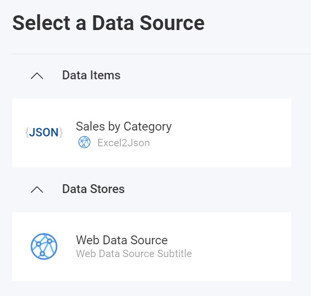 アプリケーションが実行されたら、新しい3可視化を作成すると、[データ ソースの選択] ダイアログに新しく作成された JSON データ ソース項目が表示されます。