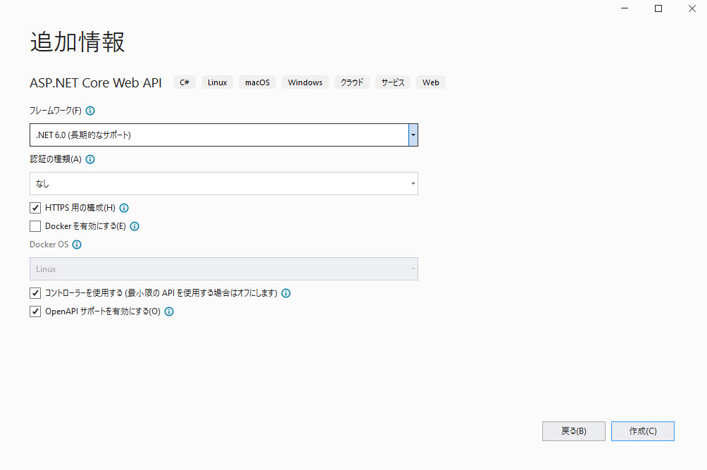 3 - フレームワーク、認証タイプ、Docker オプションを選択し、[作成] をクリックします。