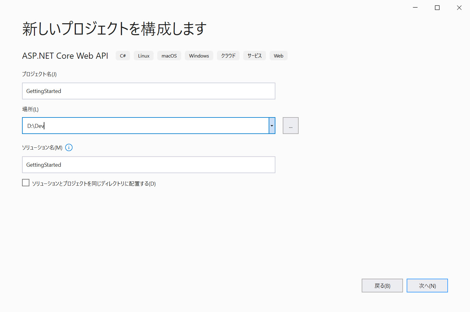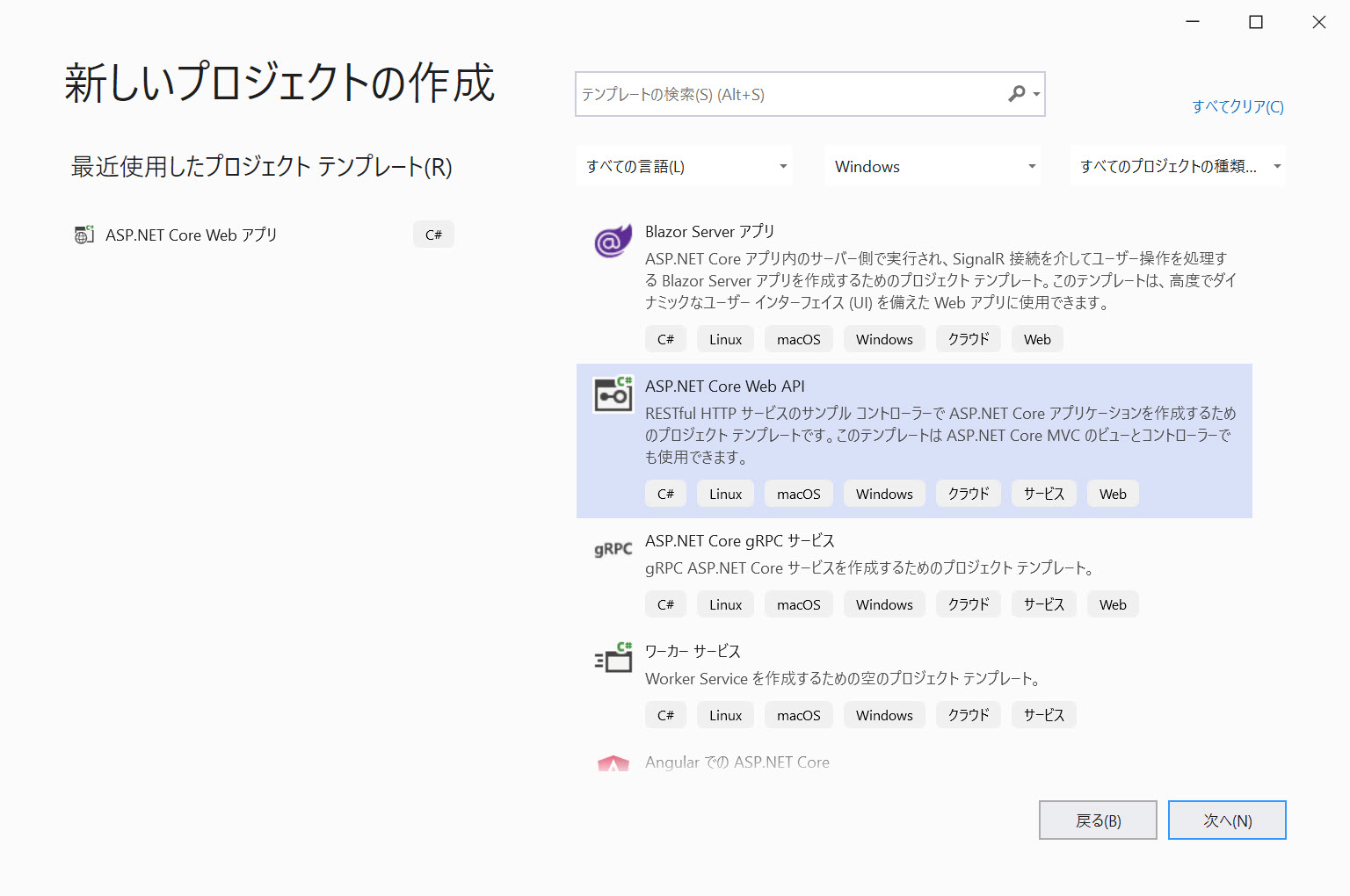 1 - Visual Studio を起動し、スタート ページで [新しいプロジェクトの作成] をクリックします。[ASP.NET Core Web API] テンプレートを 選択し、[次へ] をクリックします。