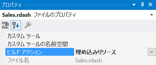 ASP.NET サーバー アプリケーションにリソースとして Reveal ダッシュボード .rdash ファイルを埋め込むには、Visual Studio でダッシュボード ファイルのプロパティを開き、.rdash ファイルの ビルド アクション を 埋め込みリソース に設定します。