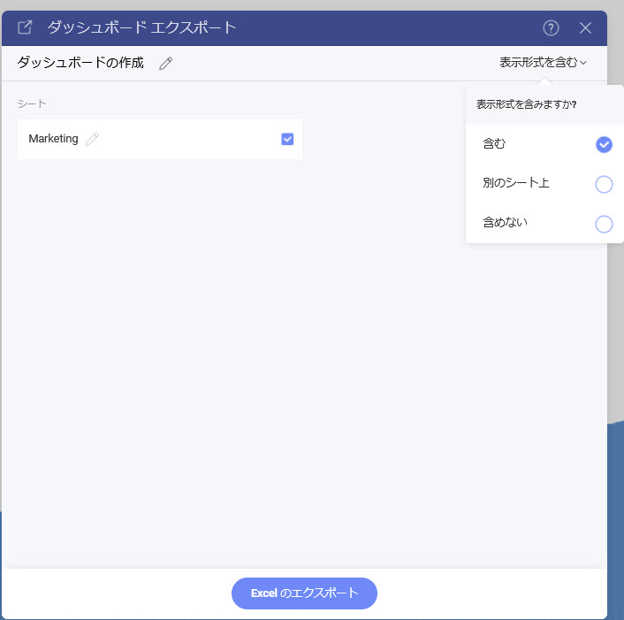 [Excel] メニュー項目をクリックすると、エンドユーザーは、ワークブックのタイトル、ワークシートのタイトル、作成するワークシート、および表示形式を含めるかどうかを変更できるさまざまなオプションを求められます。