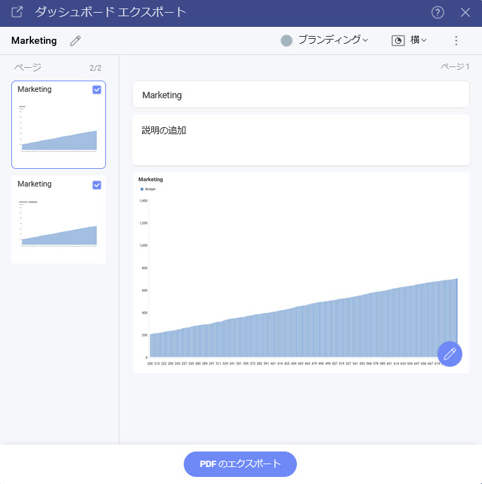 [PDF] メニュー項目をクリックすると、エンドユーザーにさまざまなオプションの入力を求められます。これにより、ユーザーは PDF ドキュメントのタイトルを変更したり、ドキュメントに含める表示形式、各表示形式のタイトルと説明、ブランド、ページの向き、言語を選択ができます。