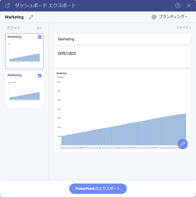 PowerPoint メニュー項目をクリックすると、エンドユーザーは、PowerPoint ドキュメントのタイトルを変更したり、ドキュメントに含める表示形式、各表示形式のタイトルと説明、およびブランディングを選択したりできるさまざまなオプションが表示されます。