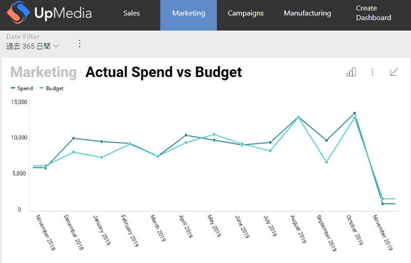 これは、Marketing サンプル (Actual Spend vs Budget) の表示形式のうちの 1 つの初期状態です: