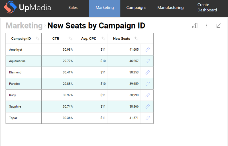 以下に、Marketing サンプルダッシュボードの New Seats by Campaign ID 表示形式の初期状態を示します。