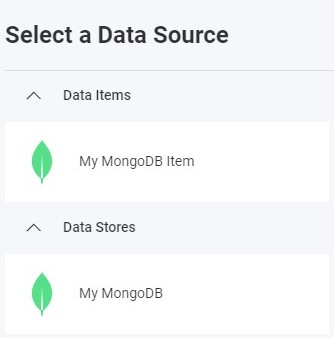 When the application runs, create a new Visualization and you will see the newly created MongoDB data source item listed in the "Select a Data Source" dialog.