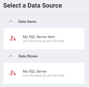 When the application runs, create a new Visualization and you will see the newly created MS SQL Server data source item listed in the "Select a Data Source" dialog.