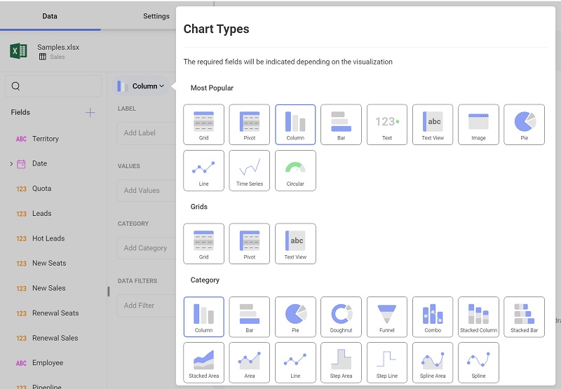 Chart Types represent various types of charts that can be used as a dashboard visualization. When creating or editing a visualization, the chart type is chosen from the Chart Types drop-down menu.
