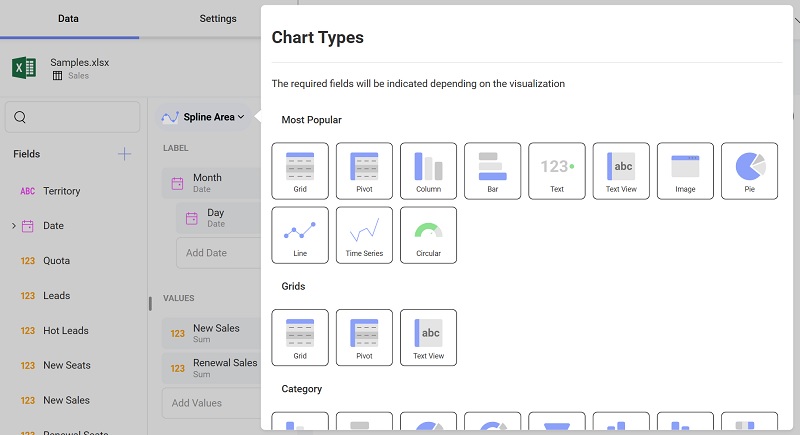 The Reveal SDK provides 37 different types of charts placed in various groups. The groups are as follows: