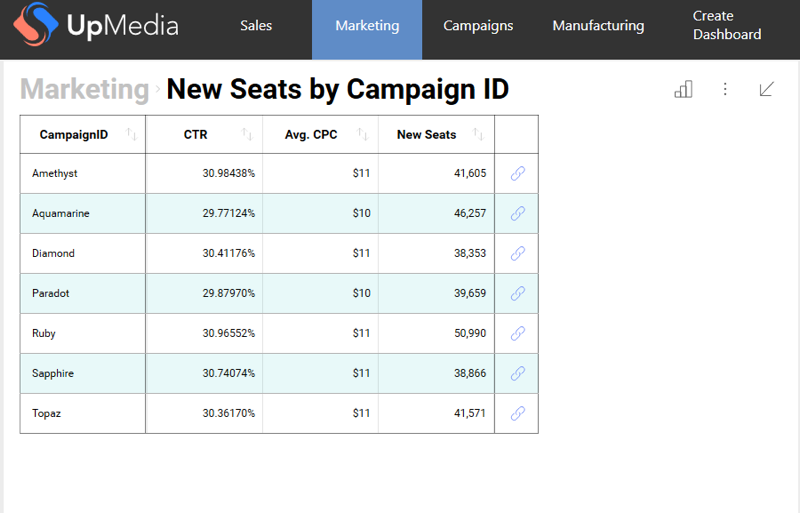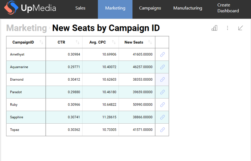 Below you see the initial state of the New Seats by Campaign ID visualization in the Marketing sample dashboard: