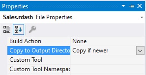 It's important to make sure we set the Copy to Output Directory value to Copy if Newer in the properties of each .rdash file. This will copy the dashboard files to disk when the project is built.