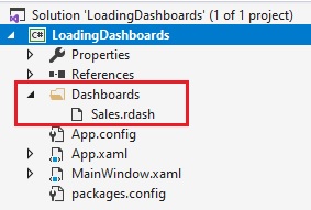 In this example, we have created a directory in our Visual Studio solution called Dashboards which will contain all the .rdash files for our application.